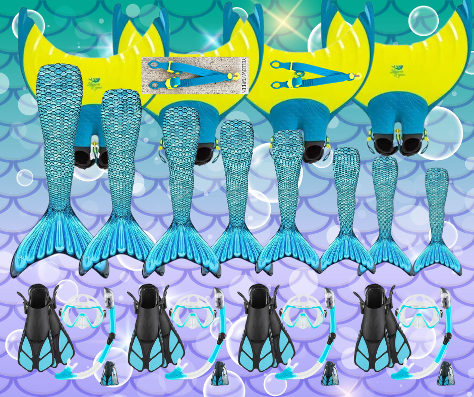Everything you need to start your PADI Mermaid Business! This package includes four Mermaid Linden Monofins, two spare fin straps, one Fin Fun Tail skin in each size (8 skins total), and four sets of mask/snorkel & fins sets.